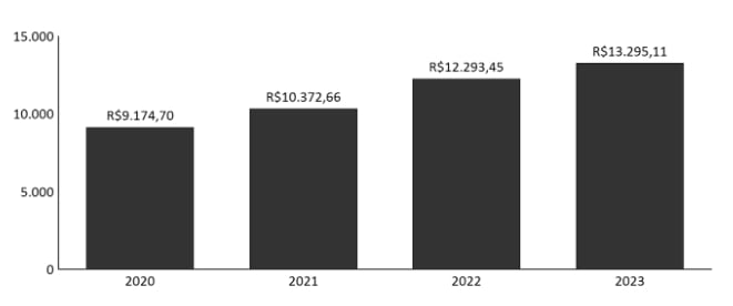 O primeiro destaque revelado na pesquisa é a evolução salarial na área, que superou a inflação. Para Product Managers, de 2022 para 2023, o salário médio estimado aumentou aproximadamente 5.86%, enquanto a inflação acumulada pelo IPCA no mesmo período foi de 4,61%. Dessa forma, no intervalo de 2022 a 2023, houve uma valorização salarial de 8,1%.