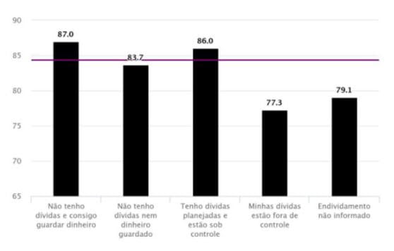 O gráfico mostra que os poupadores são também mais felizes e engajados com o trabalho, pois sua experiência é mais positiva que dos outros grupos. O grupo que possui dívidas planejadas também é muito bom, pois está acima da média geral quanto à satisfação. Este é um pessoal que, mesmo com as dívidas, consegue fazer aquisições importantes e até realizar sonhos.